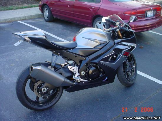 3&8RUL tag number. has red suzuki s on both sides of the rear tail. double bubble windscreen. gsxr tankpad.