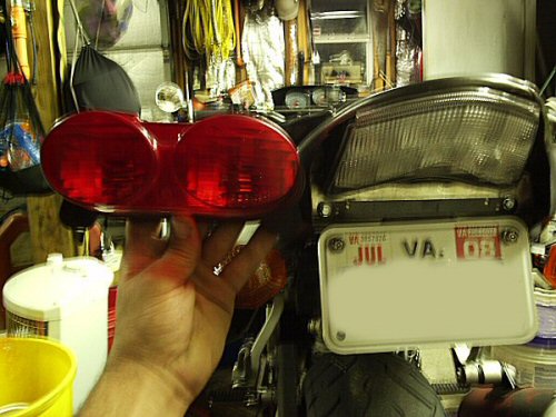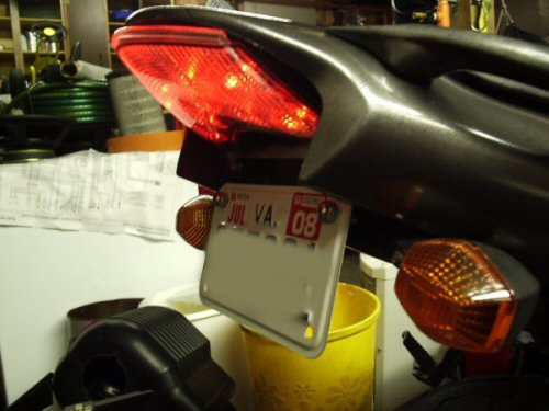 Also, I mounted a '07 ZX6R tail light to the rear. I had to cut the rear plastic (and will cut more later) to make it fit and look better. It needs more of an angle than it has, but I'm not ready to repaint the tail just yet...maybe later.
