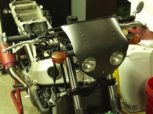 Here is a pic of when that screen was on the bike. It just didn't look too clean to me. The holes around the headlights were too large and open on one side and it didn't tuck in the way I wanted it to...so I redid it.