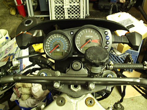 Anyway, I have the bars mounted (kawi mule risers, crf150 bars, new grips), custom mount for the brake resovoir (z1000 brake lines), and re-fabbed the upper using my '03 ZX6R's stock screen. I had to cut it down a bit more than I wanted since it is mounted closer to the lights and gauges, so it still looks similar to the origional. I do have a pic of the two together so you can compare. I think it looks cleaner.