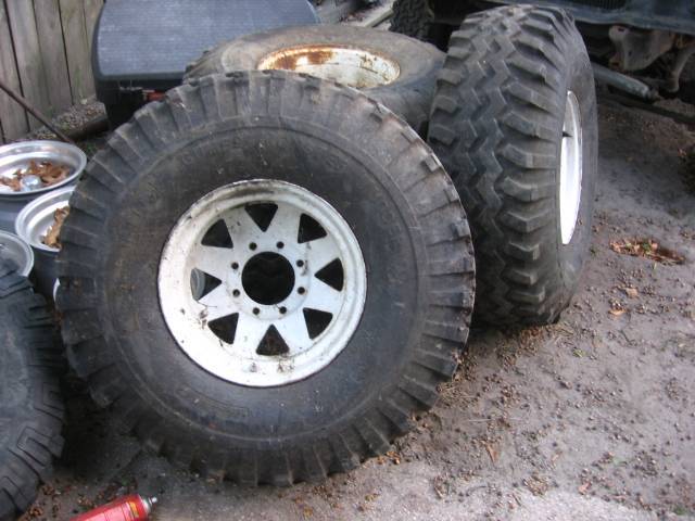 I've got a set 38.5 x 15 x R16.5" Gateway Gumbo Monster Mudders, mounted on 16.5 by I think 10" wheels.. They are 8 lug.. 8 on 6.5. The wheels are starting to rust a good bit, but could be blasted and painted back white or black or what ever color you want